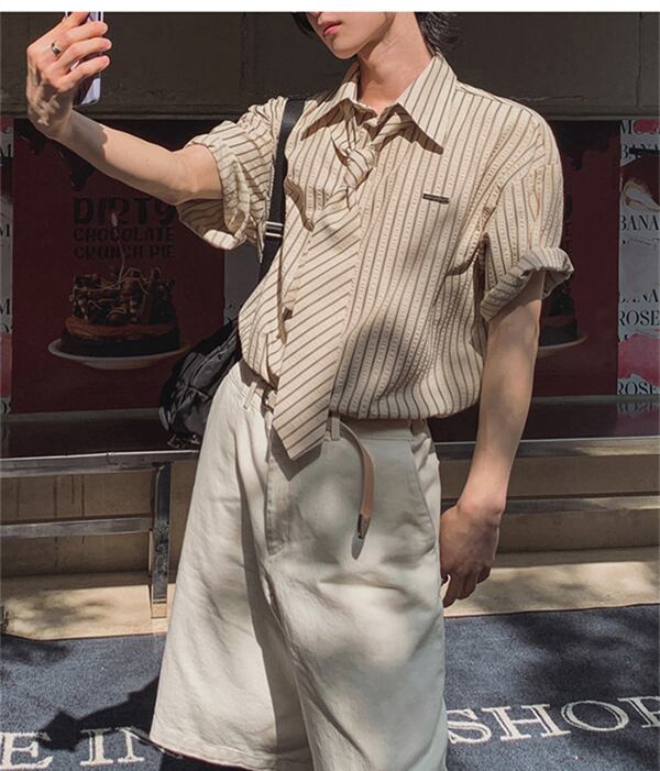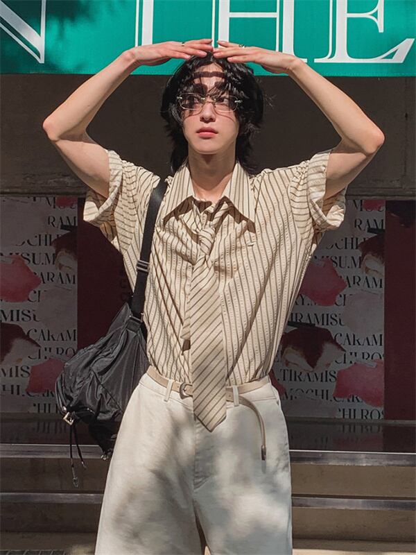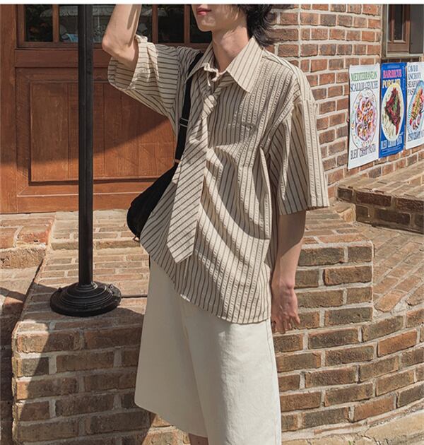 P21681 ストライプハーフワイシャツ ※ネクタイ付き ベージュ&ブルー