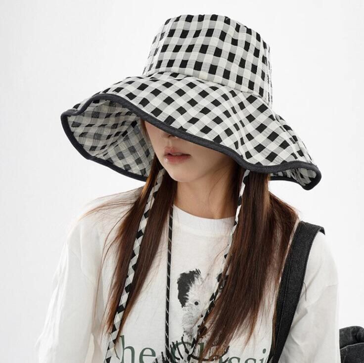 小顔効果の大きめつばバケットハット チェック柄 フィッシャーマン 日よけ アウトドア