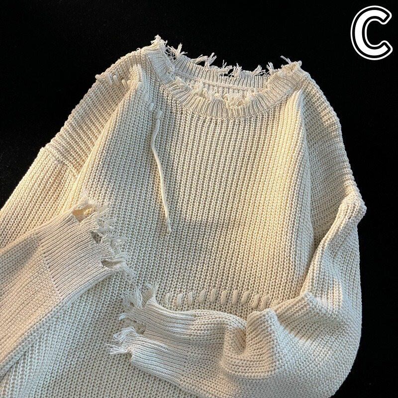 クラウンドネックダメージセーター ホワイト&ブラック&グレー