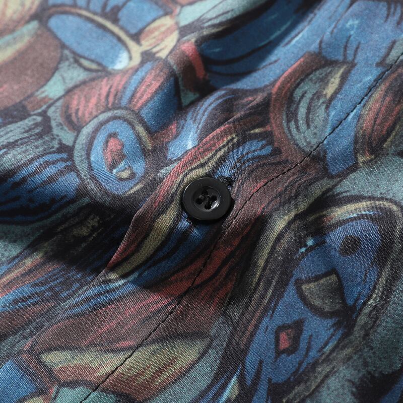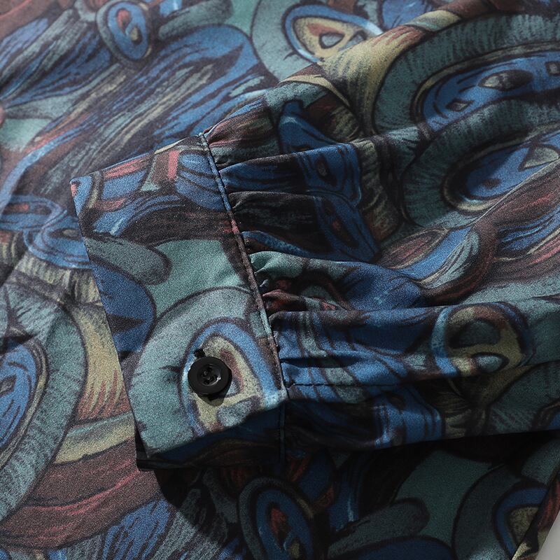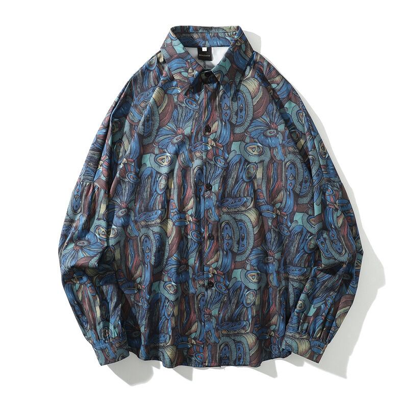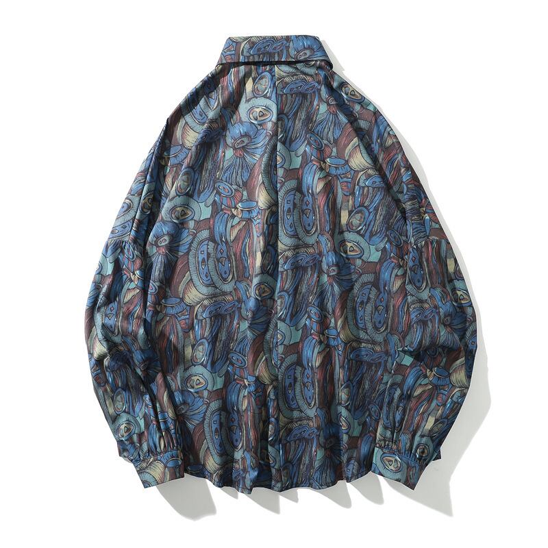 このメンズシャツは、ダーク系の神秘的な魅力とヴィンテージの独特な風合いを融合させた逸品です。